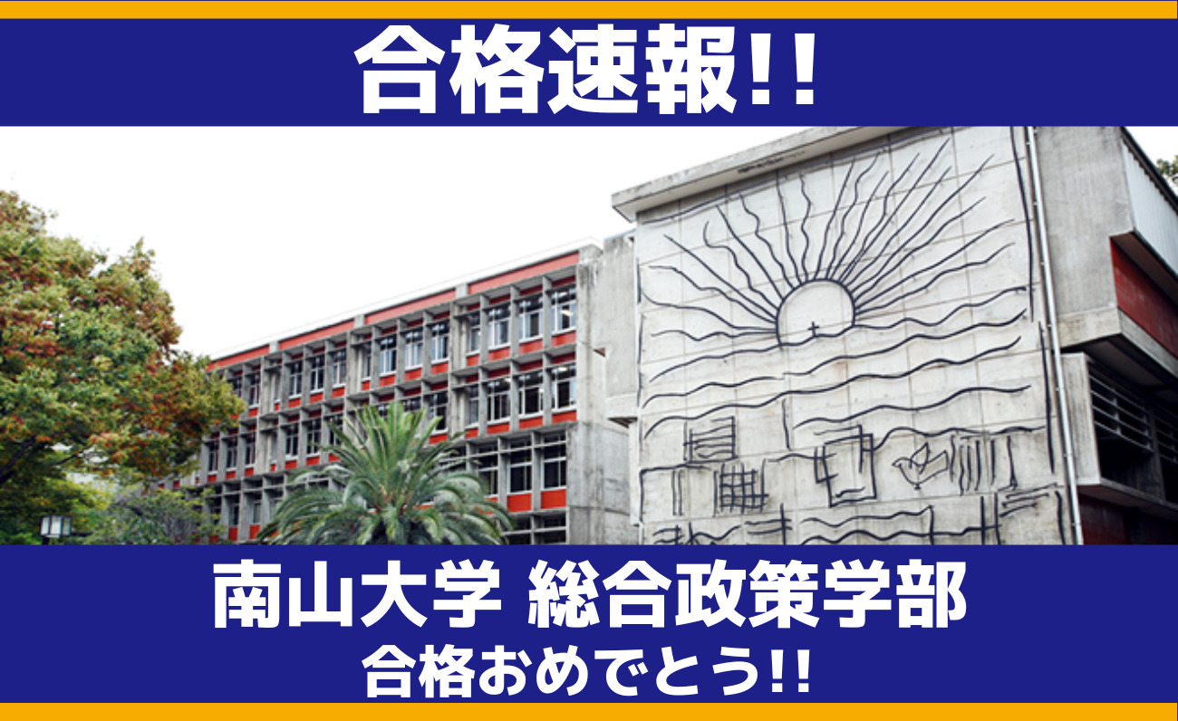 【合格速報】南山大学に合格しました。2025.11.102025.11.11 総合型選抜ニッコマでご指導しておりました生徒さんが、南山大学総合政策学部に合格しました。 合格おめでとうございます。 総合型選抜ニッコマ 投稿ナビゲーション