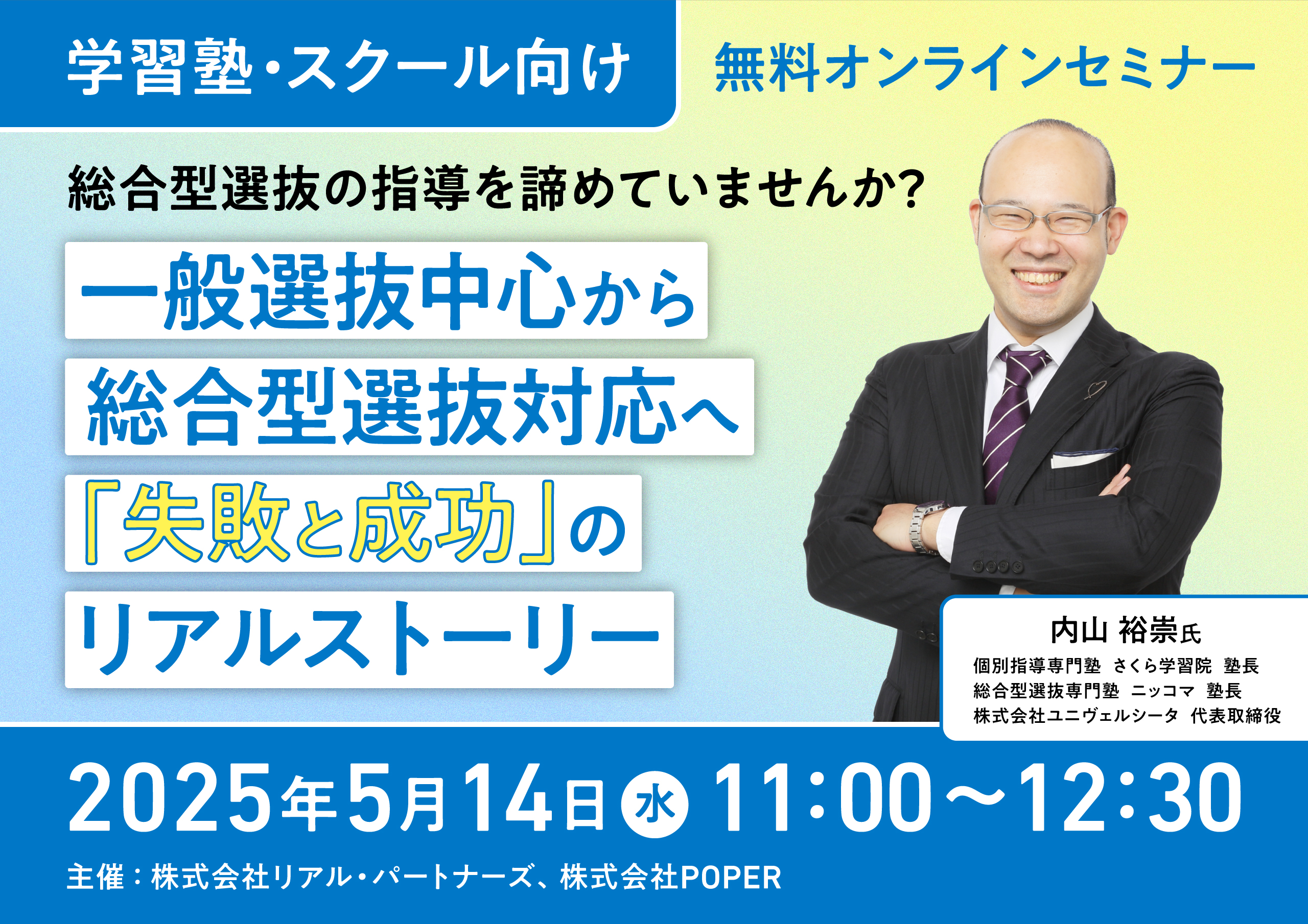 株式会社POPER(本社:東京都渋谷区、代表取締役社長:栗原慎吾、 証券コード:5134)は、学習塾・スクール運営者を対象としたオンライン セミナー「総合型選抜の指導を諦めていませんか?一般選抜中心から 総合型選抜対応へ『失敗と成功』のリアルストーリー」を2025年5月14日 (水)に開催いたします。